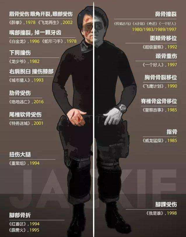 雖然成龍並沒有對外展示過,但從拍電影透露出的消息,成龍的身上,大概是傷痕纍纍。年輕的時候不明顯,年老後,會衰老得比普通人還厲害。