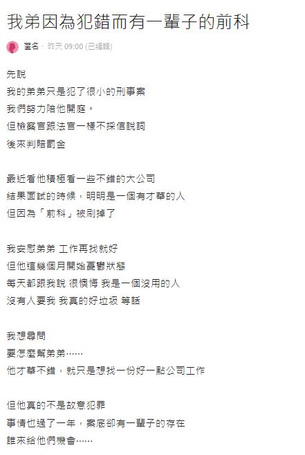 據《TVBS》報導,原PO弟弟當初犯了「很小的刑事案件」,家人們都陪著他開庭,但檢察官、法官不採信說詞,最後判賠罰金,「他真的不是故意犯罪,事情也過了一年,案底卻是一輩子的存在。」明明弟弟是個有才華的人,最近求職卻頻頻碰壁,在幾家大公司面試時,都因為有前科而被刷掉,狀態變得一蹶不振、非常消極...