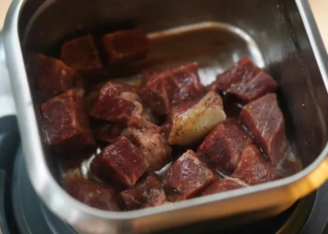 4.再放入腌制好的牛肉粒,翻炒至幾面微黃。