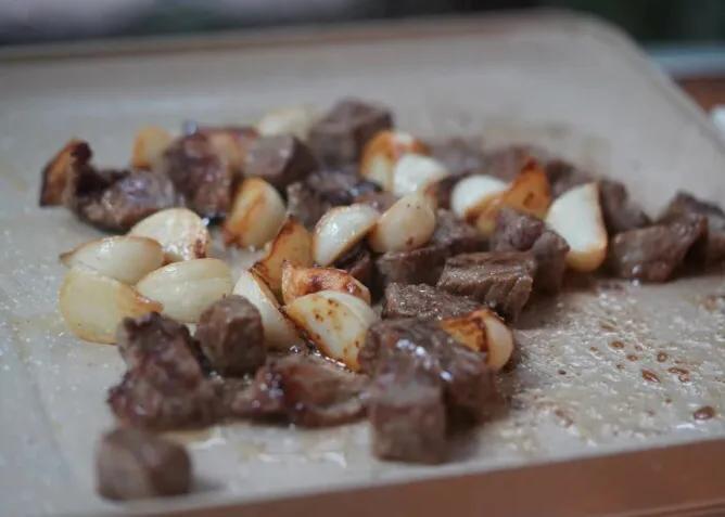 將炒好的蒜粒和牛肉粒,加入1勺蚝油,少許白糖,適量黑胡椒碎,翻炒均勻,翻炒一下就可以啦~