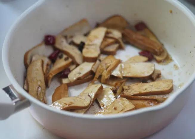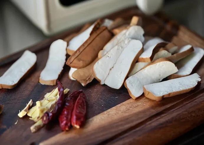 1.新鮮的香乾3塊切成小片,準備3顆干辣椒和10克小黃薑絲,放入小黃薑絲,干辣椒段,乾花椒10顆,翻炒幾下;