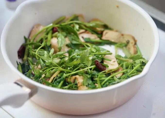 3.加入帶葉的野生水芹段,根據個人口味調入適量鹽,繼續翻炒;