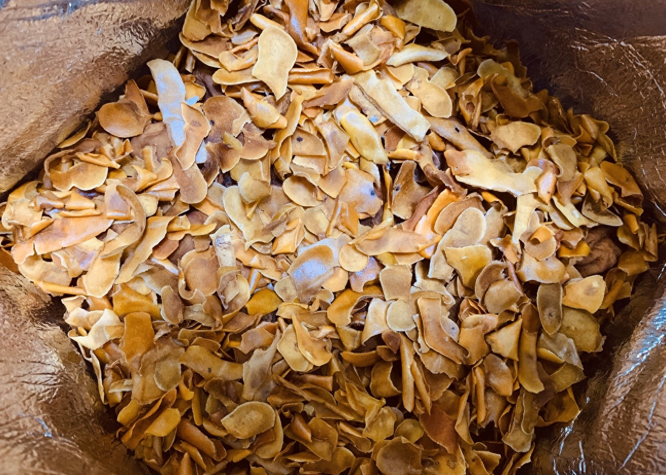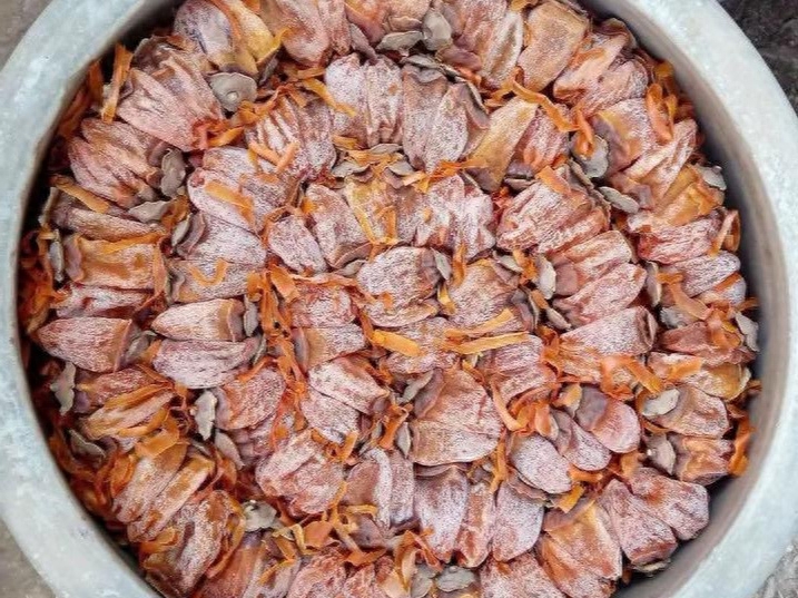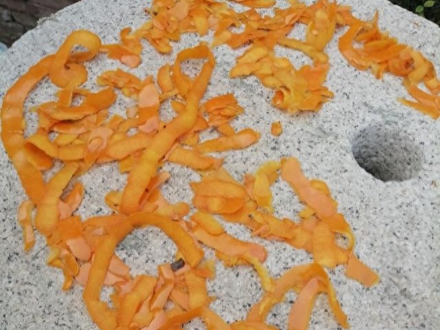 4、削掉的柿子皮,不要扔掉,這個東西大有用處,它可以幫助柿子生白霜,鋪在地面上,找個乾凈的地方曬著,晾乾過幾天用。